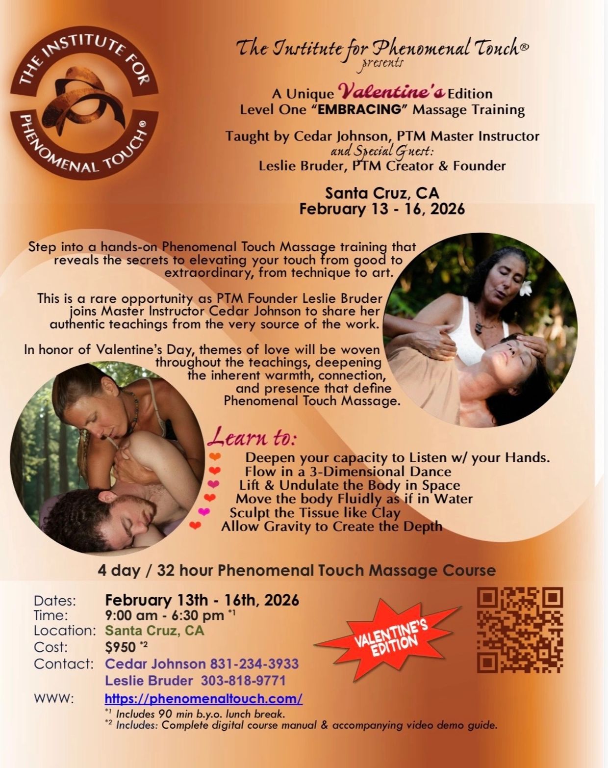 We are excited to be able to share this unique, sacred & exquisite form of massage with you. Level One includes all the signature principles and moves of Phenomenal Touch® massage.
